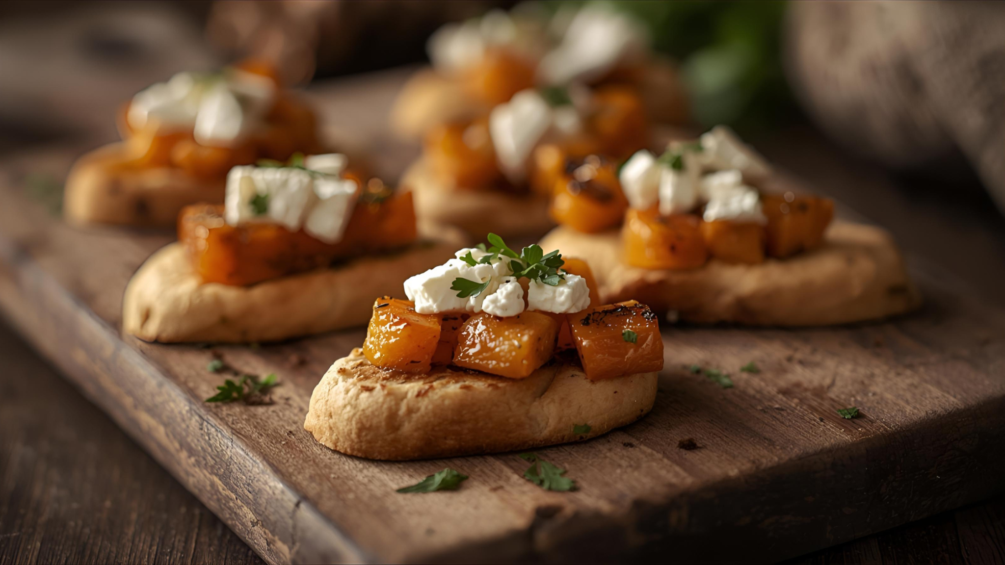 - Top toasted baguette slices with roasted squash and feta.